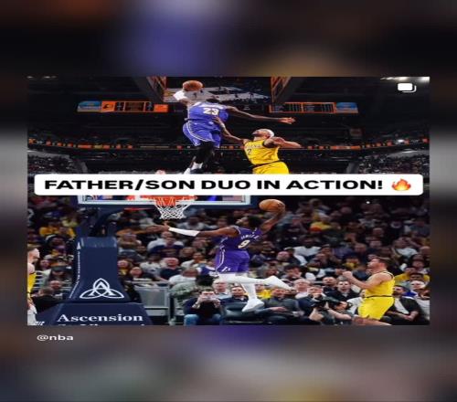 賽后詹姆斯更新了個人社媒,曬出自己和布朗尼同場扣籃帥照。配文寫道:“上陣父子兵!