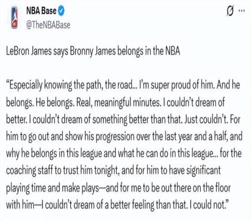 “這是真實(shí)且有意義的出場(chǎng)時(shí)間,沒(méi)有比這更好的結(jié)果了,真的沒(méi)有,”詹姆斯說(shuō)道,“他走上場(chǎng),我的意思是顯然他……在這近一年半的時(shí)間里,他的進(jìn)步有目共睹。也證明了他為什么配得上在這個(gè)聯(lián)盟打球,以及他能在這個(gè)聯(lián)盟做到什么。所以,教練組今晚信任他,給他大量出場(chǎng)時(shí)間,還讓他完成了幾次精彩的配合——而我能和他并肩站在球場(chǎng)上,這種感覺(jué)……真的沒(méi)有比這更好的了,真的沒(méi)有?!?/p>