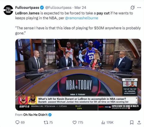 3月24日,ESPN記者蕾夢(mèng)娜-謝爾伯恩透露,詹姆斯拿5000萬年薪的時(shí)代已經(jīng)過去了,勒布朗也愿意在今夏降薪,以此來幫助湖人續(xù)約奧斯汀-里夫斯與補(bǔ)強(qiáng)陣容。(但她沒有說勒布朗會(huì)接受多大的降薪幅度,這一切都需要佩林卡去談)