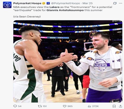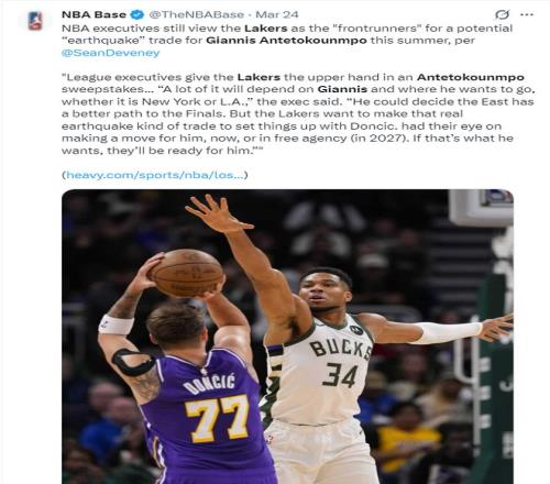 北京時(shí)間3月25日,NBA記者肖恩-迪瓦尼透露,NBA高層認(rèn)為湖人隊(duì)今夏可能完成涉及揚(yáng)尼斯-阿德托昆博的‘重磅交易’,湖人是得到字母哥的熱門球隊(duì)。