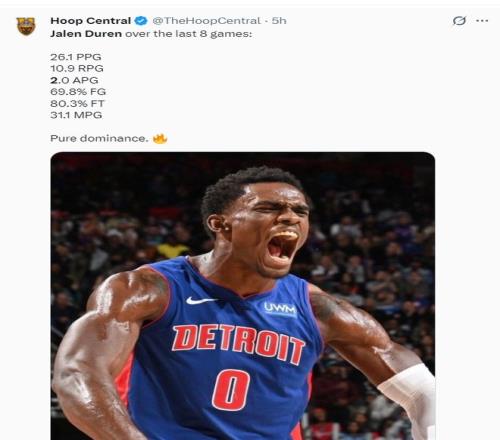 坎寧安因?yàn)闅庑厝毕倪@6場(chǎng)比賽,杜倫場(chǎng)均30.7分鐘,拿到26.5分10.1籃板2.7助攻0.8搶斷0.8蓋帽,命中率67.5%,他明顯成為了活塞的第一箭頭。
