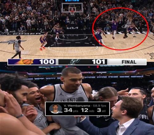 其中對(duì)陣太陽(yáng)的比賽,最后時(shí)刻馬刺落后1秒,文班亞馬還讀秒完成了一記“杜蘭特式”的后仰中投絕殺。