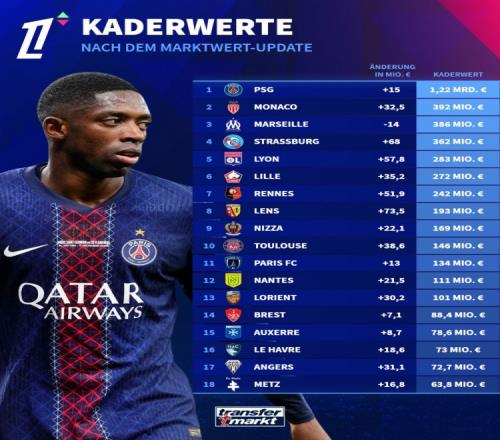 法甲球隊身價排名:巴黎12.2億歐斷層居首,摩納哥3.92億歐次席