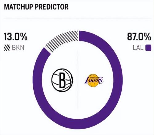 賽前,美媒ESPN對本場比賽進行了勝率預(yù)測,湖人隊勝率高達87.0% ,籃網(wǎng)勝率則僅有13.0%,差距有點大 。