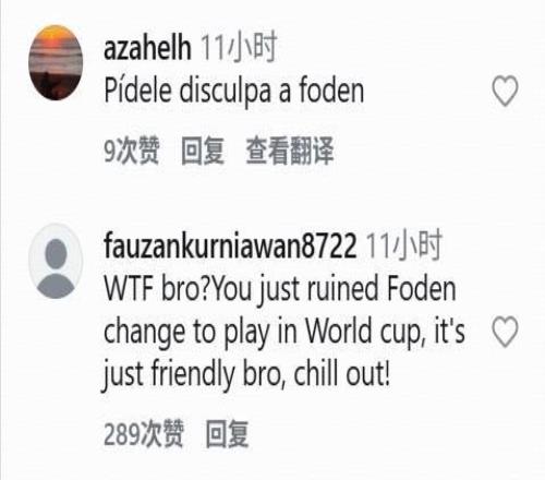 “搞什么。你剛毀掉了福登踢世界杯的機會,這只是友誼賽,冷靜?。ㄗⅲ核`打成了‘改變’change,賽后門將特拉福德稱,福登沒有大問題。)”