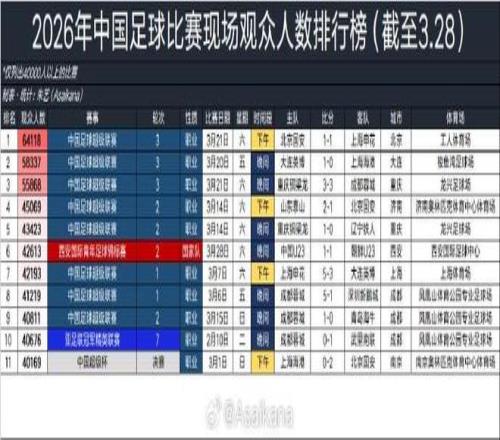 3月28日晚,德國(guó)轉(zhuǎn)會(huì)市場(chǎng)亞洲區(qū)管理員朱藝 在社媒羅列了截止目前,2026年中國(guó)足球比賽的上座數(shù)排行,京滬大戰(zhàn)居首,成都蓉城的主場(chǎng)鳳凰山體育場(chǎng)則獨(dú)占前十中的三席。