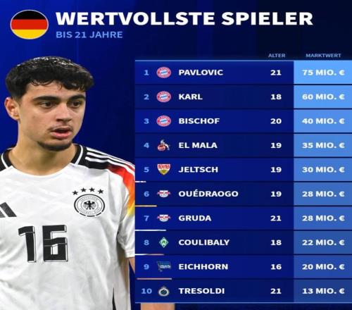 北京時間3月29日,在完成了歐洲五大聯(lián)賽球員的身價更新之后,德轉(zhuǎn)列出了德國U21球員身價前10,拜仁慕尼黑占據(jù)前3位,亞歷山大-帕夫洛維奇7500萬歐元第1,倫納特-卡爾6000萬歐元第2,比朔夫4000萬歐元第3。