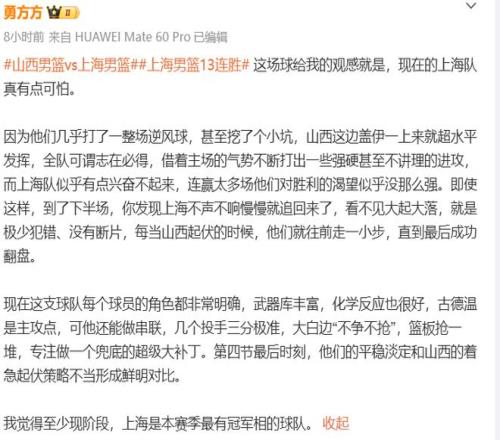 贏球的上海拿到第13場(chǎng)連勝,繼續(xù)高居聯(lián)賽榜首,這場(chǎng)勝利對(duì)于上海隊(duì)來(lái)說(shuō)也是相當(dāng)提氣的,賽后媒體人勇方方更是直言:這場(chǎng)球給我的觀感就是,現(xiàn)在的上海隊(duì)真有點(diǎn)可怕,至少現(xiàn)階段,上海是本賽季最有冠軍相的球隊(duì)。