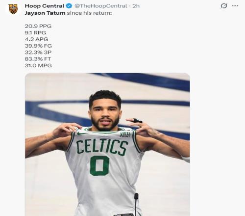 塔圖姆本賽季復(fù)出的11場(chǎng)比賽綠凱拿到9勝2負(fù),塔圖姆場(chǎng)均31分鐘,拿到20.9分9.1籃板4.2助攻1.1搶斷0.2蓋帽,命中率39.9%,三分命中率32.3%,雖然效率還是不佳但數(shù)據(jù)已經(jīng)恢復(fù)到接近20+10+5。