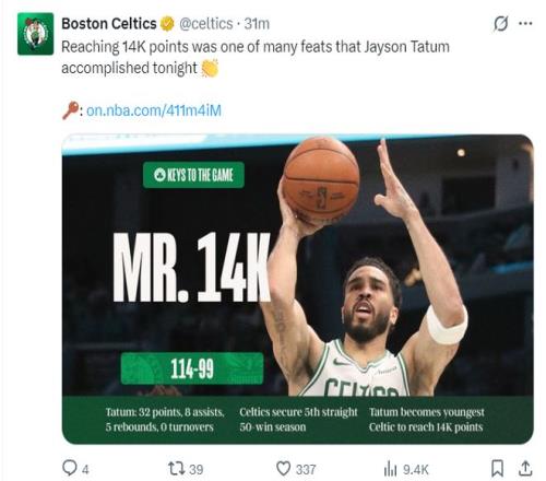 這場(chǎng)比賽是杰森-塔圖姆職業(yè)生涯14000分里程碑,但也不只是1.4萬分里程碑,凱爾特人官方曬出了塔圖姆與綠凱更多的紀(jì)錄。