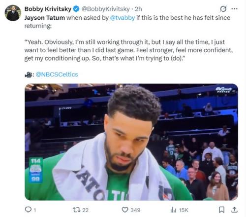 賽后塔圖姆接受采訪,他表示:這場(chǎng)比賽的確是自己復(fù)出以來最佳狀態(tài),自己一直都在克服傷病帶來的心理恐懼感。我一直告訴自己要比上一場(chǎng)表現(xiàn)出色,要感覺自己更強(qiáng)壯,更有信心,提升我的體能水平。目前我正在逐步的調(diào)整與恢復(fù)自己的競(jìng)技狀態(tài)。