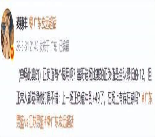 廣東男籃完成復(fù)仇,廣東媒體人麥穗豐老師也站出來為備受質(zhì)疑的張皓嘉發(fā)聲了,他在社交平臺公開發(fā)聲,“(單場比賽的)正負值有個屁用???嘉哥這場比賽的正負值是全隊最低的-12,但正常人都覺得他打得不錯;上一場正負值沖到+49了,在場上有存在感嗎?”