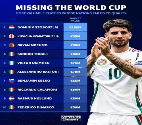 德轉(zhuǎn)統(tǒng)計(jì)出無(wú)緣2026年美加墨世界杯的球員身價(jià)TOP10,索博斯洛伊以1億歐元居首,意大利4人上榜。