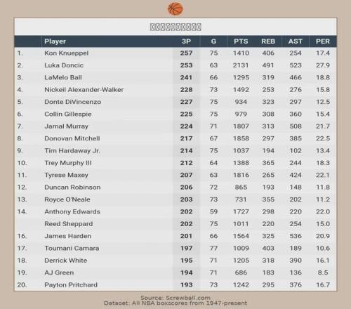 個(gè)人數(shù)據(jù)和帶隊(duì)成績雙雙爆發(fā),讓克尼佩爾在新秀榜始終占據(jù)第一位置,力壓“美國之子”25屆狀元秀弗拉格,后者本賽季至今出戰(zhàn)64場比賽,場均上陣33.8分鐘得到20.3分6.6板4.5助1.2斷,三項(xiàng)命中率46.7%、27.8%和81.2%,獨(dú)行俠以24勝52負(fù)已徹底無緣附加賽。