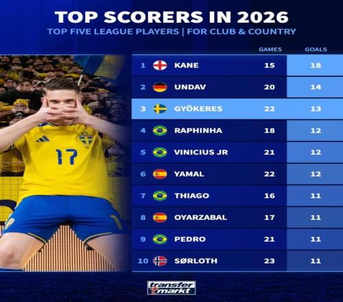 北京時間4月2日,德轉(zhuǎn)統(tǒng)計出了歐洲五大聯(lián)賽球員2026年國家隊+俱樂部賽事的進球榜,哈里-凱恩以15場18球排名第一,在世預賽附加賽決賽中用進球幫助瑞典晉級世界杯的哲凱賴什以13球排名第三。