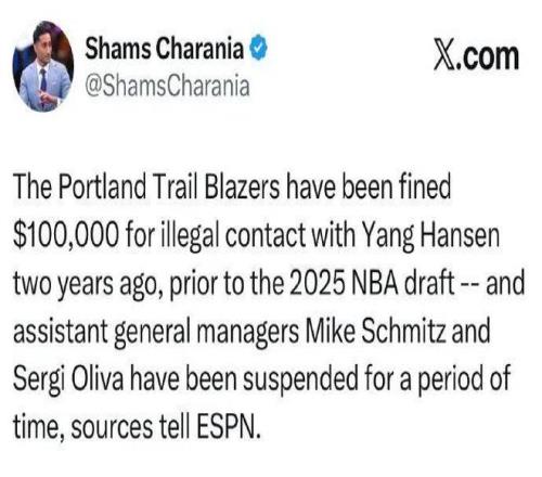 爆料王Shams:開(kāi)拓者因在選秀前與楊瀚森違規(guī)接觸被罰款10萬(wàn)美元,同時(shí)助理總經(jīng)理奧利瓦和施密茨被停薪&停職兩周。