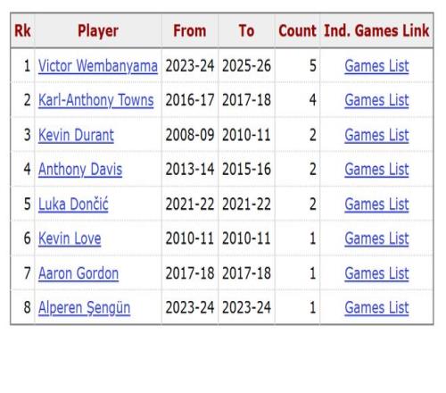在現(xiàn)役球員中,23歲前砍下過40分15板的球員還有:杜蘭特(2次)、濃眉(2次)、東契奇(2次)、樂福(1次)、戈登(1次)、申京(1次)。