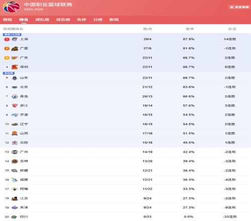CBA最新排名!3隊(duì)搶第3,北京掉第6,遼寧坐10望8,北控守住第12