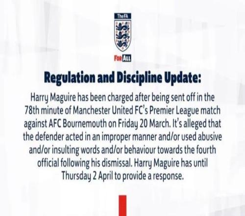 英足總確認(rèn),哈里·馬奎爾在對(duì)陣伯恩茅斯的比賽中被紅牌罰下后被指控行為不當(dāng),他須在4月2日前作出回應(yīng)。