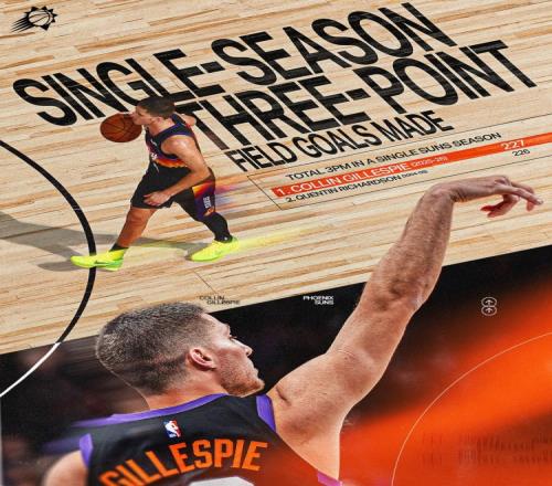 第二節(jié)比賽,吉萊斯皮再中三分,本場已命中2記三分,目前總數(shù)227記,超越昆汀·理查德森創(chuàng)造太陽隊(duì)史單賽季三分命中數(shù)新紀(jì)錄!