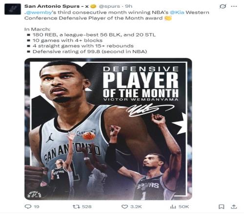 這場(chǎng)比賽之前NBA官方公布了約最佳防守球員,文班亞馬180籃板56蓋帽20搶斷,有10場(chǎng)比賽至少4封蓋,連續(xù)4場(chǎng)比賽籃板15+,防守效率99.8聯(lián)盟第二。但這場(chǎng)對(duì)陣快船的比賽文班亞馬不會(huì)登場(chǎng)。(本賽季61場(chǎng)比賽還差4場(chǎng)評(píng)獎(jiǎng))