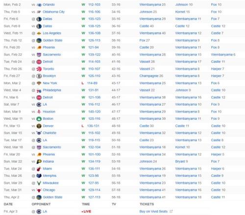 北京時(shí)間4月3日,NBA常規(guī)賽,馬刺大勝快船拿到11連勝,最近的29場(chǎng)比賽馬刺贏下其中的27場(chǎng)。這場(chǎng)比賽馬刺最多領(lǐng)先快船26分,雖然快船一度追到個(gè)位數(shù),末節(jié)馬刺又一波流拉開分差,沒有文班亞馬也拿到背靠背勝利。