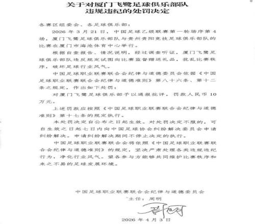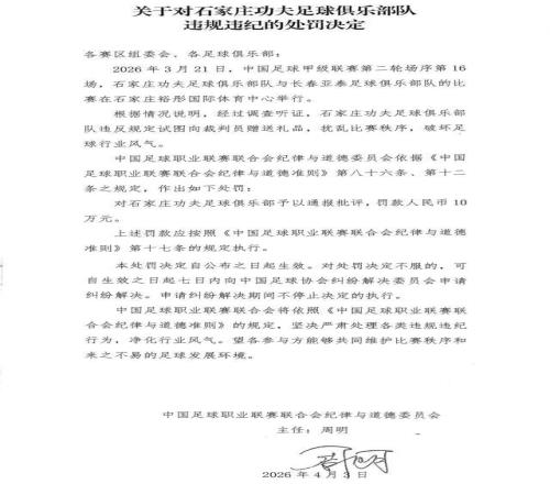 4月3日,中足聯(lián)發(fā)布處罰公告:中甲石家莊功夫在對(duì)陣長(zhǎng)春亞泰的比賽時(shí)試圖向裁判員贈(zèng)送禮品,中乙廈門(mén)飛鷺在對(duì)陣貴州貴陽(yáng)競(jìng)技的比賽中試圖向比賽監(jiān)督贈(zèng)送禮品,兩隊(duì)都被通報(bào)批評(píng),并罰款10萬(wàn)元人民幣。此外,中乙廈門(mén)賽區(qū)(廈門(mén)飛鷺主場(chǎng))“將應(yīng)由賽區(qū)負(fù)責(zé)的比賽官員接待工作違規(guī)轉(zhuǎn)由第三方執(zhí)行”,被通報(bào)批評(píng)。