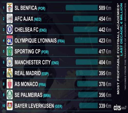 過去十年最賺錢青訓(xùn):本菲卡第一,阿賈克斯、切爾西分列二三
