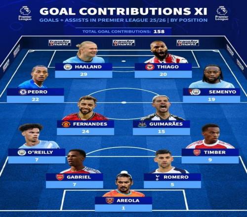 中場:若昂·佩德羅(切爾西,22球)、B費(fèi)(曼聯(lián),24球)、吉馬良斯(紐卡,15球)、塞梅尼奧(伯恩茅斯/曼城,19球)