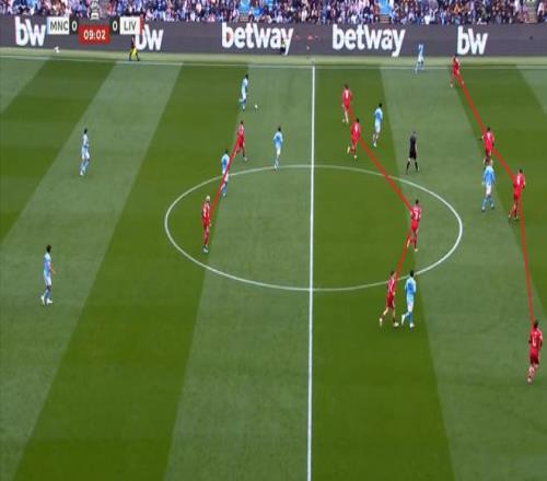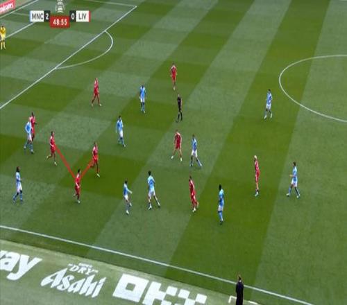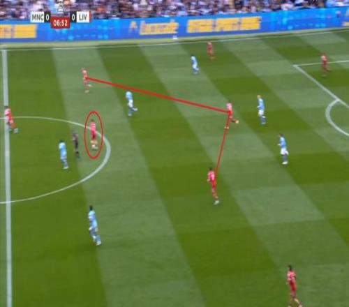 所以在進(jìn)攻的時(shí)候,利物浦的雙前鋒會(huì)拉得非常開(kāi),幾乎會(huì)呈現(xiàn)出各自負(fù)責(zé)一個(gè)半扇的思路,以此來(lái)吸引曼城的防守注意力,從而為中路和遠(yuǎn)端制造空間。