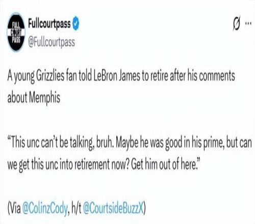 詹姆斯并非第一個吐槽這座城市的球員,安東尼-愛德華茲和德雷蒙德-格林此前也都批評過孟菲斯。但詹姆斯的言論還是在灰熊球迷中引發(fā)了強烈不滿。近日,一位情緒激動的小球迷甚至讓這位41歲的巨星直接掛靴退役。