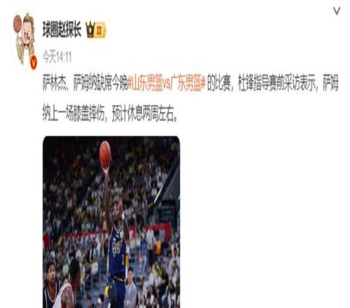 薩林杰、薩姆納缺席這場比賽,杜鋒指導(dǎo)賽前采訪表示,薩姆納上一場膝蓋摔傷,預(yù)計(jì)休息兩周左右。