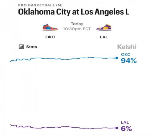 體育預(yù)測(cè)媒體Kalshi Hoops預(yù)測(cè)今日湖人取勝概率為6%。