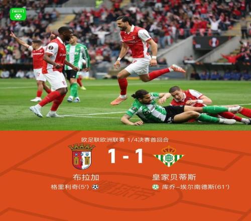 北京時間4月9日歐足聯(lián)歐洲聯(lián)賽1/4決賽首回合,布拉加對陣皇家貝蒂斯。格里利奇閃擊,下半場阿布德造點,庫喬-埃爾南德斯點射破門。最終比分布拉加 1-1 皇家貝蒂斯。
