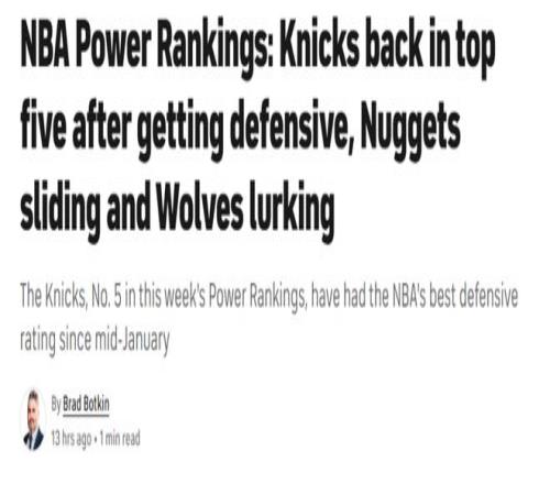 1-5名(括號內(nèi)為上期排名):馬刺(1)、雷霆(3)、活塞(2)、凱爾特人(4)、尼克斯(9)