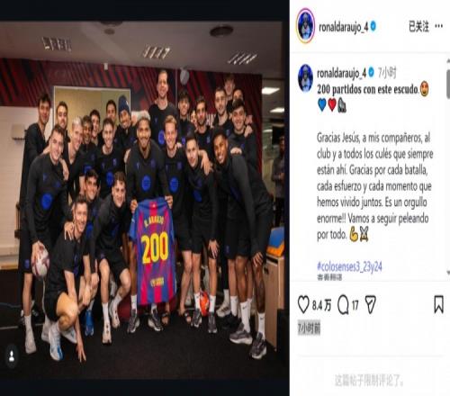 阿勞霍此役為巴薩替補(bǔ)出場(chǎng),這是他為巴薩出戰(zhàn)的第200場(chǎng)比賽,阿勞霍獲贈(zèng)紀(jì)念球衣,他在社媒曬出與全隊(duì)的合照,并寫(xiě)道:“身穿巴薩球衣的第200場(chǎng)比賽。