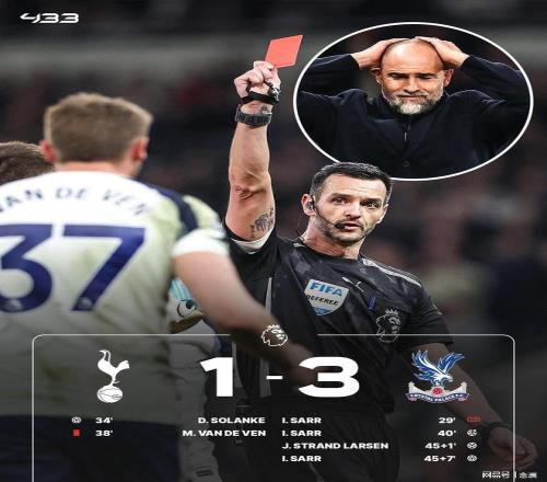 英超第29輪,熱刺主場1-3負于水晶宮,5連敗+11輪不勝,積29分僅領先降級區(qū)1分。薩爾進球被吹,索蘭克建功,范德芬送紅點,薩爾點射命中+雙響,拉爾森破門,丹索頭球攻門、索蘭克小角度射門被撲。