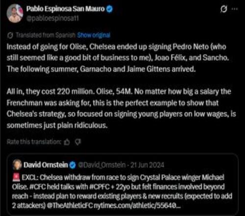球迷Pablo San Mauro把賬單甩到Reddit上,評(píng)論區(qū)直接炸了。有人翻舊賬:「奧利斯根本不想來」——立刻被反駁。真相是2023年切爾西因「違規(guī)接觸」被水晶宮抓包,奧利斯順勢續(xù)約漲薪;等到2024年再出手,拜仁的工資報(bào)價(jià)藍(lán)軍根本跟不起。