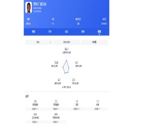霍勒迪是出色的側(cè)翼投手,擁有接球投、持球投等能力。本賽季他的場均三分命中率高達47%,該數(shù)據(jù)排在外援榜單中首位,而且比自己的投籃命中率還高。