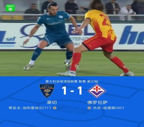 北京時間4月21日意大利足球頂級聯(lián)賽 聯(lián)賽 第33輪,萊切主場對陣佛羅倫薩。萊切蒂亞戈-加布里埃爾破門。佛羅倫薩杰克-哈里森破門。最終比分萊切 1-1 佛羅倫薩。