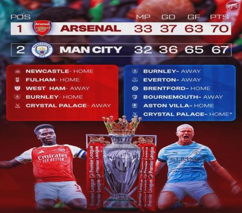 阿森納和曼城剩余賽程對比。