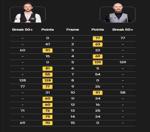 第一階段戰(zhàn)罷賈德·特魯姆普5-4領先,第二階段加里·威爾遜扳平比分至5-5,隨后賈德·特魯姆普連勝五局最終10-5戰(zhàn)勝對手晉級16強。