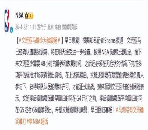據(jù)名記SHAMS報道,文班亞馬已被確診為腦震蕩,將于次日接受進一步神經(jīng)學(xué)評估。根據(jù)NBA聯(lián)盟規(guī)定,腦震蕩球員在受傷后48小時內(nèi)不得參與任何訓(xùn)練或比賽,復(fù)出必須通過逐級醫(yī)學(xué)評估。