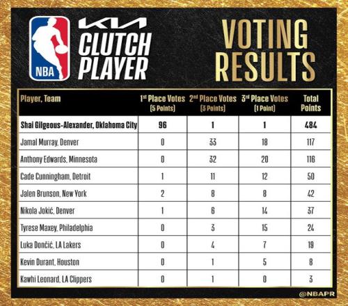 亞歷山大獲得100張第一選票中的96張,總計484分。談及當選年度最佳關鍵球員時,亞歷山大說道:“這個獎項對我意義重大。想要拿到這份榮譽,你必須在比賽末段帶領球隊拿下勝利。比起一切,贏球才是我最看重的事。我的隊友和教練都信任我,愿意在關鍵時刻把球交到我手里,我也會每晚全力以赴、扛起責任…… 能收獲這個獎項,真的很棒?!?/p>